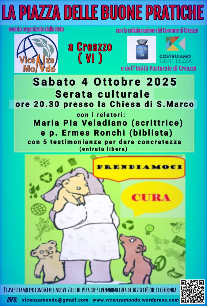 Il sabato 4 ottobre è stata realizzata la Serata Culturale della Piazza delle Buone Pratiche per approfondire il tema Prendiamoci cura, con la presenza della scrittrice Maria Pia Veladiano e del bliblista Ermes Ronchi, e con 5 importanti testimonianze sul Prendersi cura di tutto quello che ci circonda