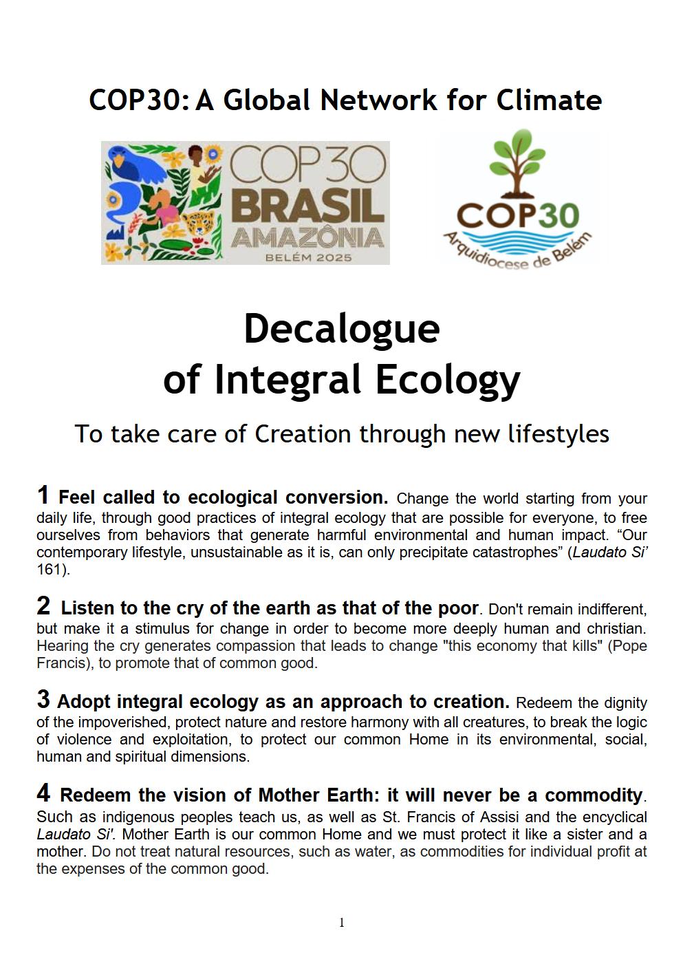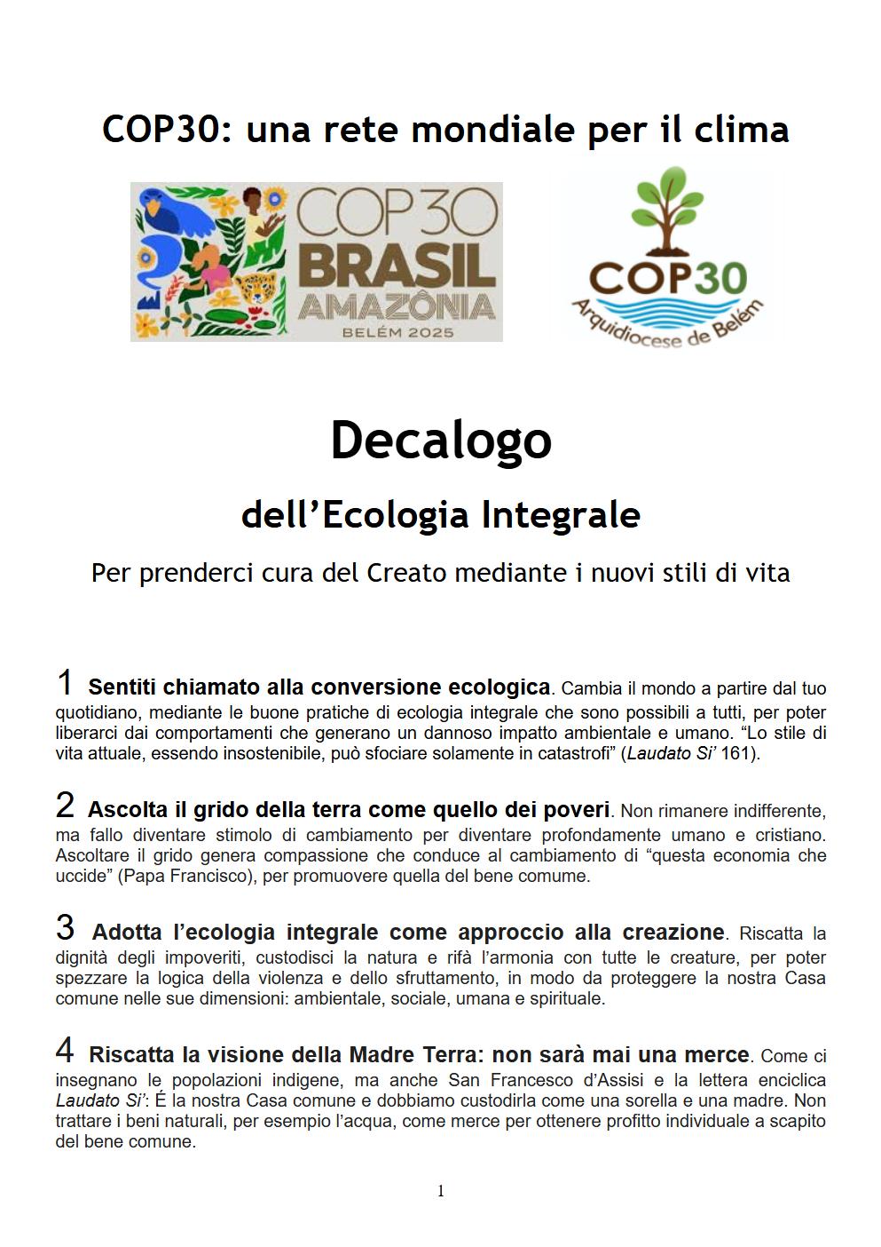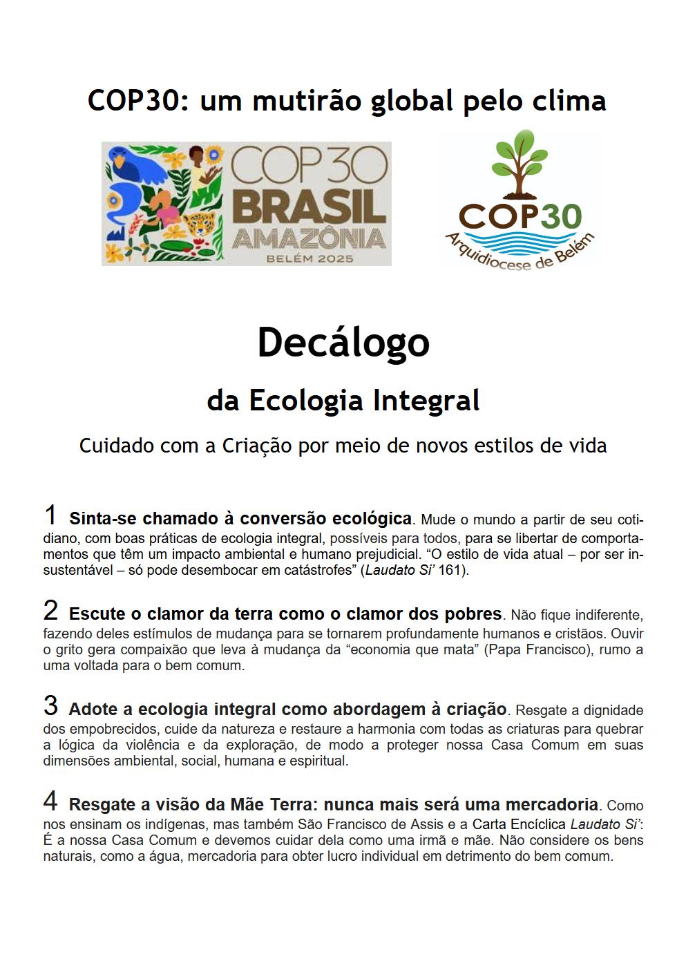 Cari amici e care amiche, su richiesta della Chiesa amazzonica ho preparato il decalogo dell’ecologia integrale per la COP30 che sta accadendo a Belèm (Parà) in Brasile dal 10 al 21 novembre 2025. La Conferenza delle Parti (COP) è il più grande evento globale per le discussioni e i negoziati sui cambiamenti climatici. La città scelta, nel cuore dell’Amazzonia, fornirà al mondo un’occasione unica per discutere di soluzioni climatiche, rafforzare il multilateralismo e promuovere il consenso sugli obiettivi globali per ridurre le emissioni di gas serra.