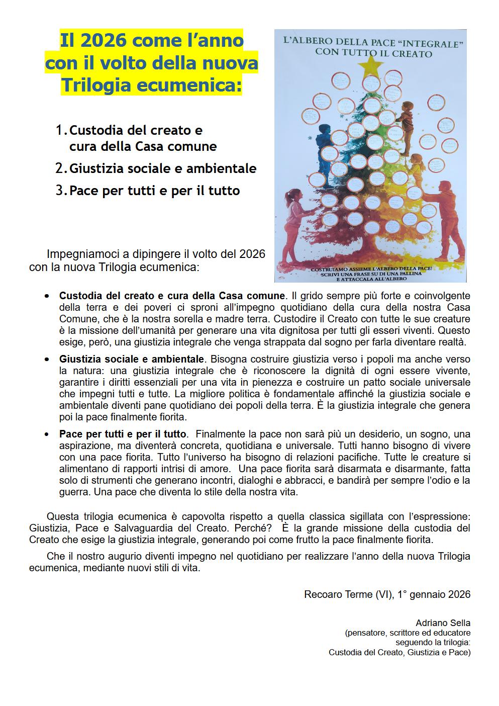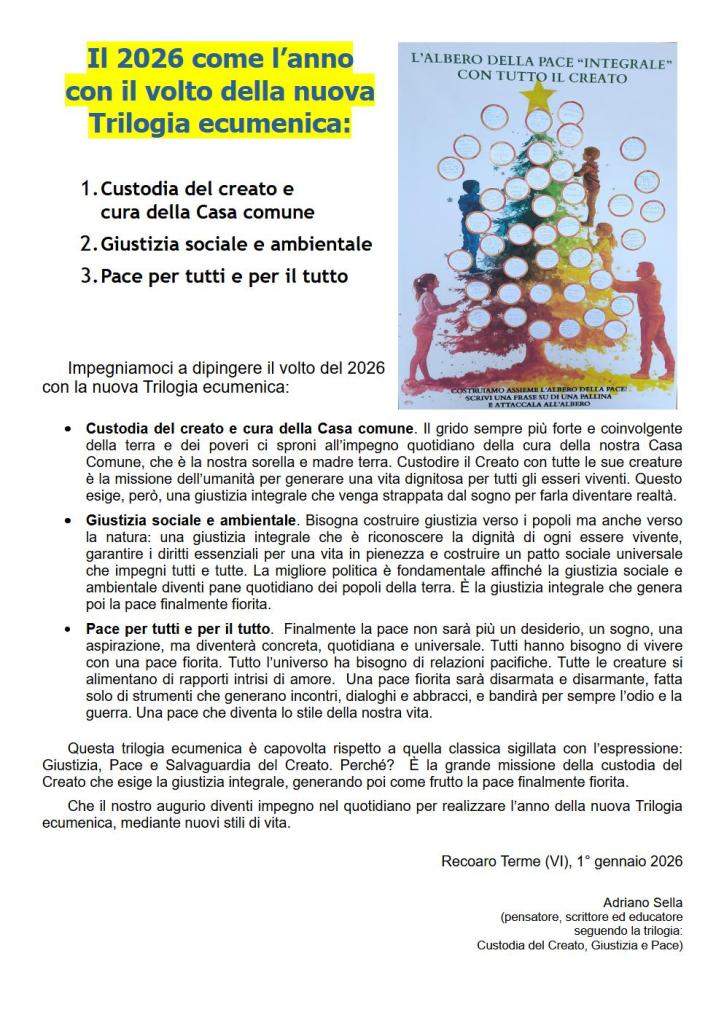 Augurissimi! Che il 2026 sia l’anno della nuova Trilogia ecumenica: Custodia del Creatoe cura della Casa Comune; Giustizia sociale e ambientale; Pace per tutti e per il tutto.