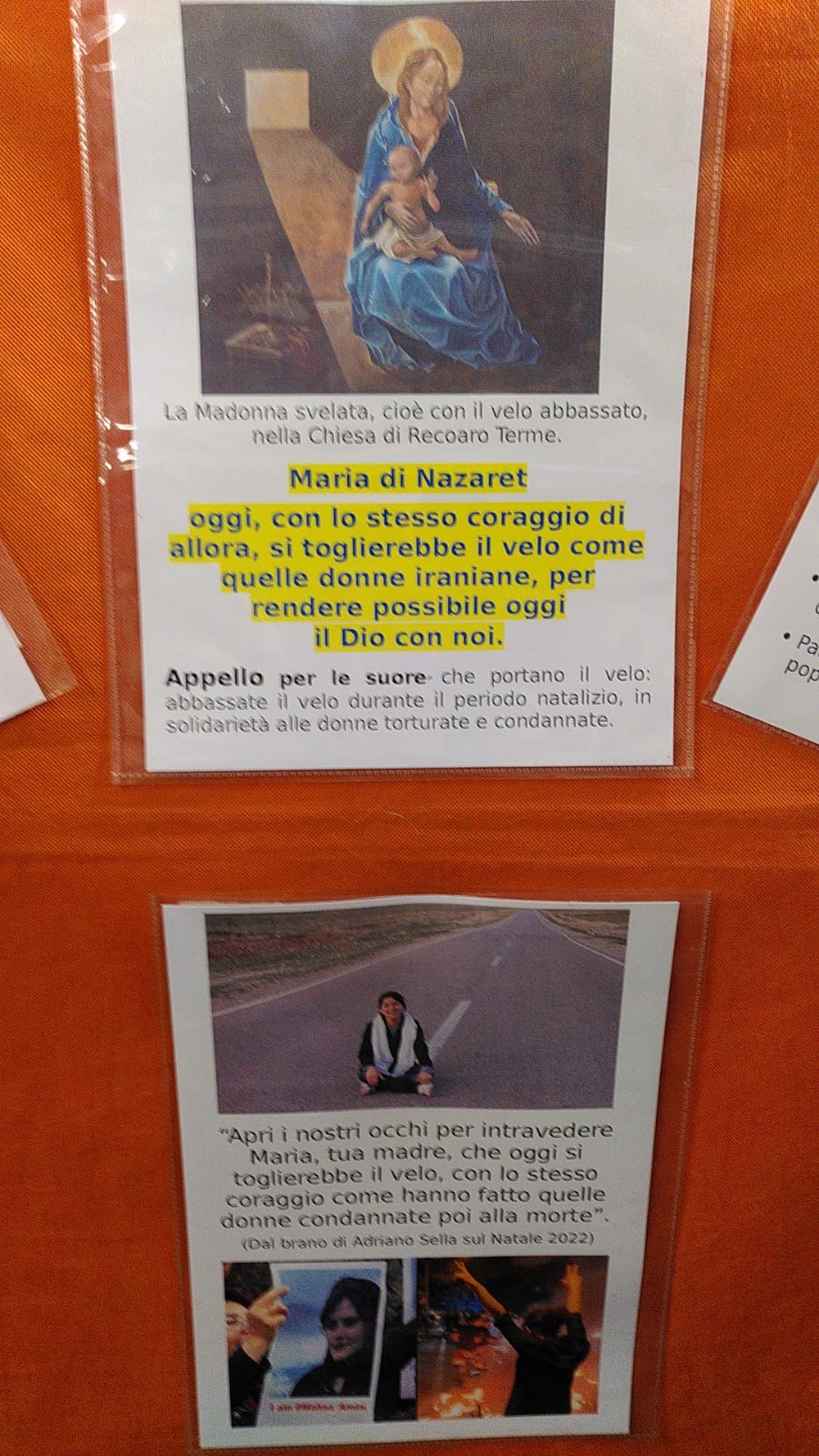 Nel primo pannello, presentando Maria, la madre di Dio, si dichiara che Maria di Nazaret oggi, con lo stesso coraggio di allora, si toglierebbe il velo come quelle donne iraniane, per rendere possibile oggi il Dio con noi. Nel pannello c’è anche appello per le suore che portano il velo: “Abbassate il velo durante il periodo natalizio, in solidarietà con le donne torturate e condannate”. Inoltre, viene anche evidenziato che nella Chiesa di Recoaro Terme c’è l’immagine della Madonna svelata, cioè con il velo abbassato
