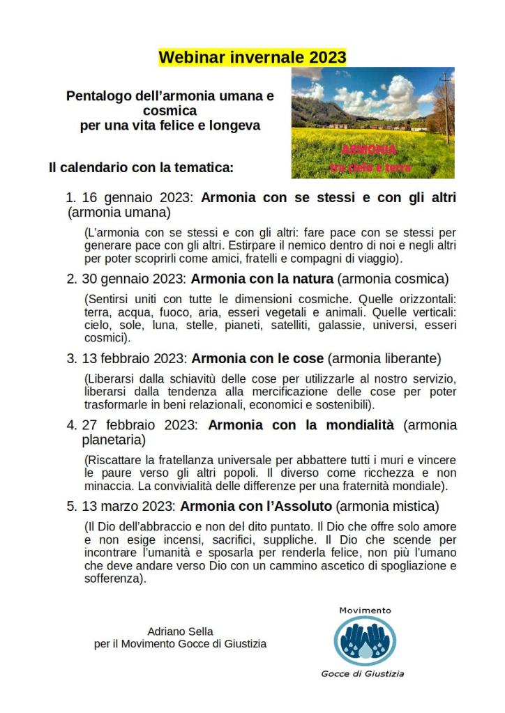 Stasera ci sarà la seconda serata del Webinar sul tema Armonia con la natura (armonia cosmica), con la presenza del giovane testimone, Francesco Omesti, 20 anni e amante della natura. Il materiale della prima serata è a disposizione sul sito http://www.goccedigiustizia.it