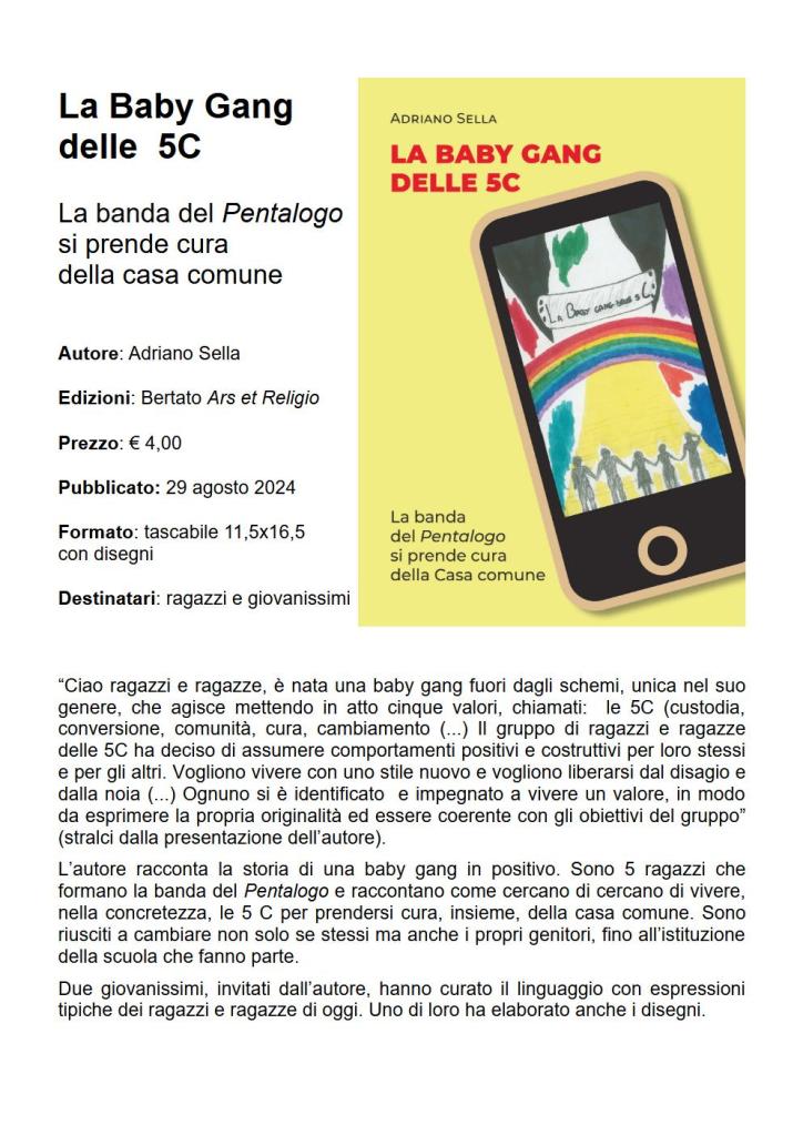 La Baby Bang delle 5 C è un racconto per ragazzi e giovanissimi, pubblicato il 29 agosto 2024. È la storia della Baby Gang delle 5C, cioè finalmente una baby gang in positivo. Sono ragazzi e ragazze che raccontano come riescono a vivere le 5C (custodia, conversione, comunità, cura, cambiamento) per la cura della casa comune. Si tratta di un libretto tascabile 11,5×16,5 di 32 pagine, con un prezzo basso, appena € 4,00. È stato stampato in tipografia per poter tenere un prezzo basso, e quindi molto accessibile a tutti. Per questo, non viene trovato nelle librerie, ma potete fare la richiesta all’autore e verrà spedito via corriere postale. Si tratta di uno strumento, adatto ai ragazzi e giovanissimi, per coinvolgerli nella cura della casa comune, sia durante il Mese del Creato ma anche durante tutto l’anno.