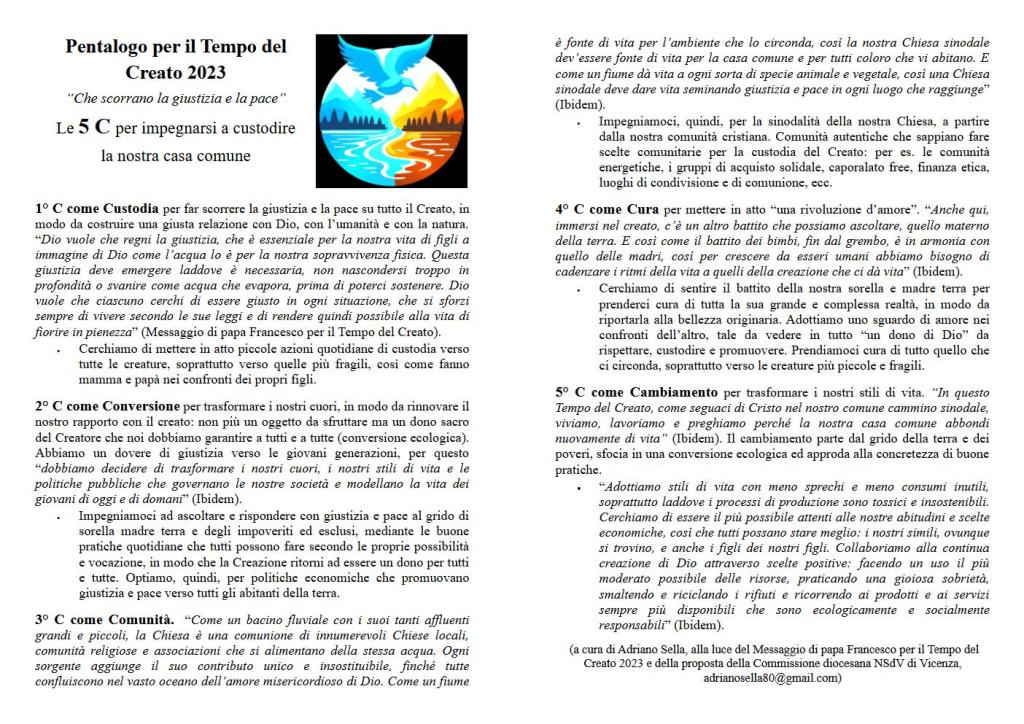 Le 5 C per il Tempo del Creato: dal 1° settembre al 4 ottobre 2023. Per impegnarsi a custodire la nostra casa comune: sorella e madre terra.