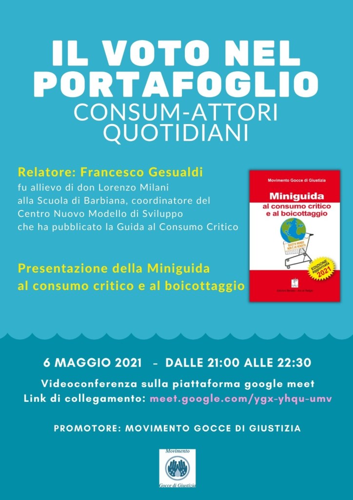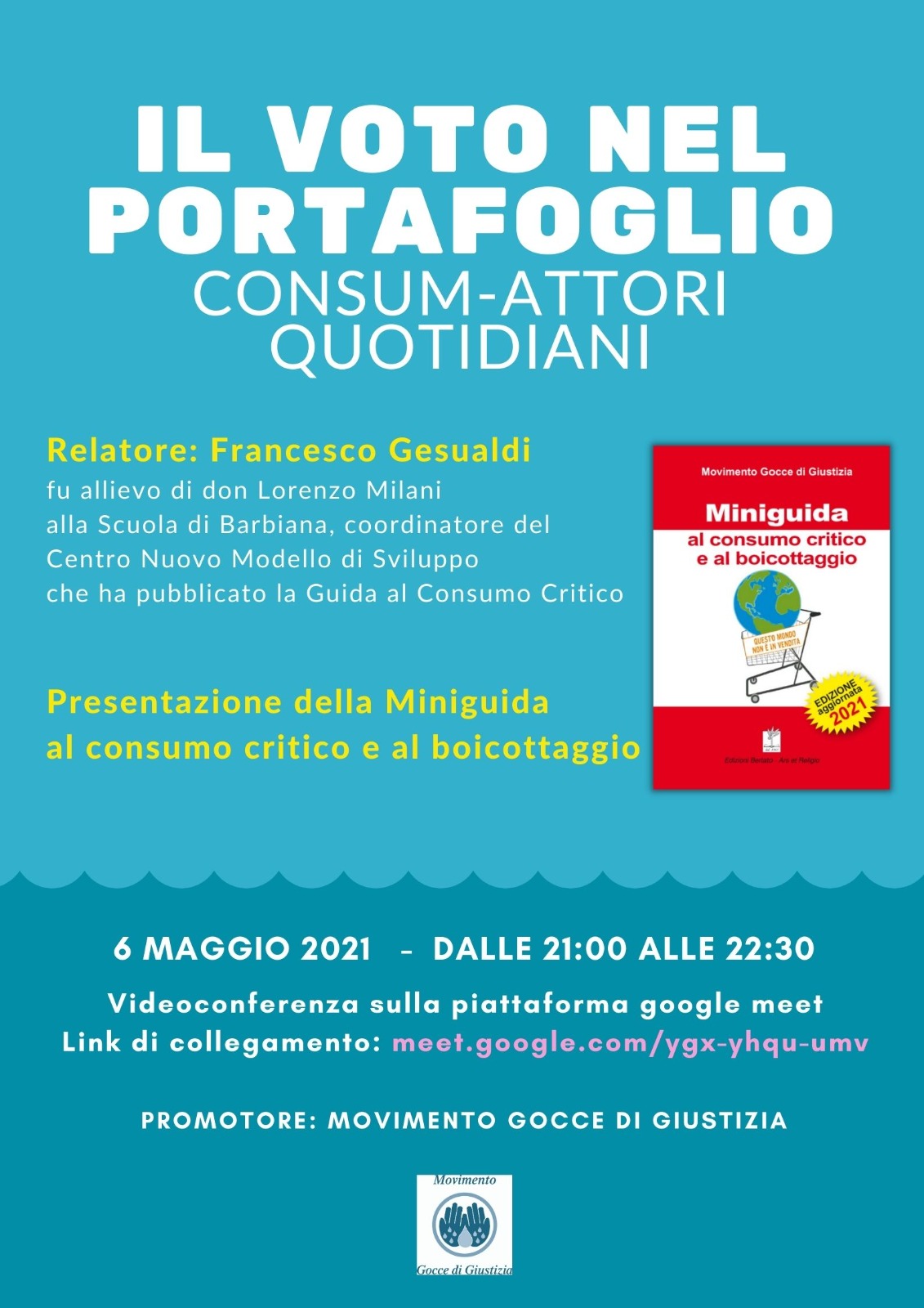Per presentare la nuova edizione (11°) della Miniguida al consumo critico e al boicottaggio, il Movimento Gocce di Giustizia promuove una videoconferenza con la presenza di Francesco Gesualdi, il quale approfondirà l’argomento sul “Voto nel portafoglio – consum-attori quotidiani”.