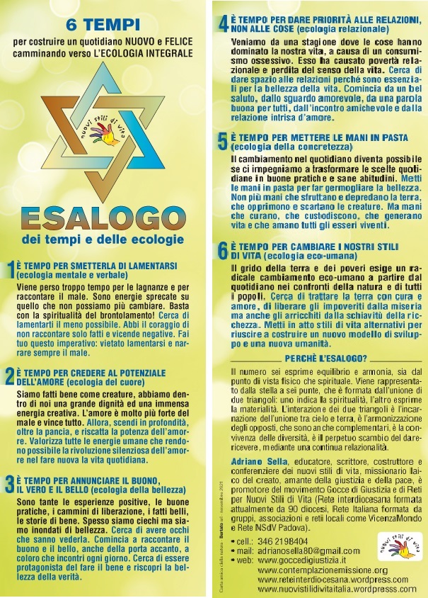 Esalogo: i sei tempi e ecologie per costruire un quotidiano nuovo e felice camminando verso l’ecologia integrale